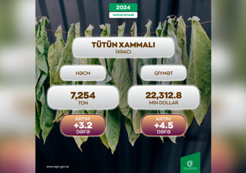 Ötən ilin müvafiq dövrü ilə müqayisədə tütün xammalı ixracında 3,2 dəfə, satılmış məhsulun dəyərində isə 4,5 dəfə artım qeydə alınıb.
