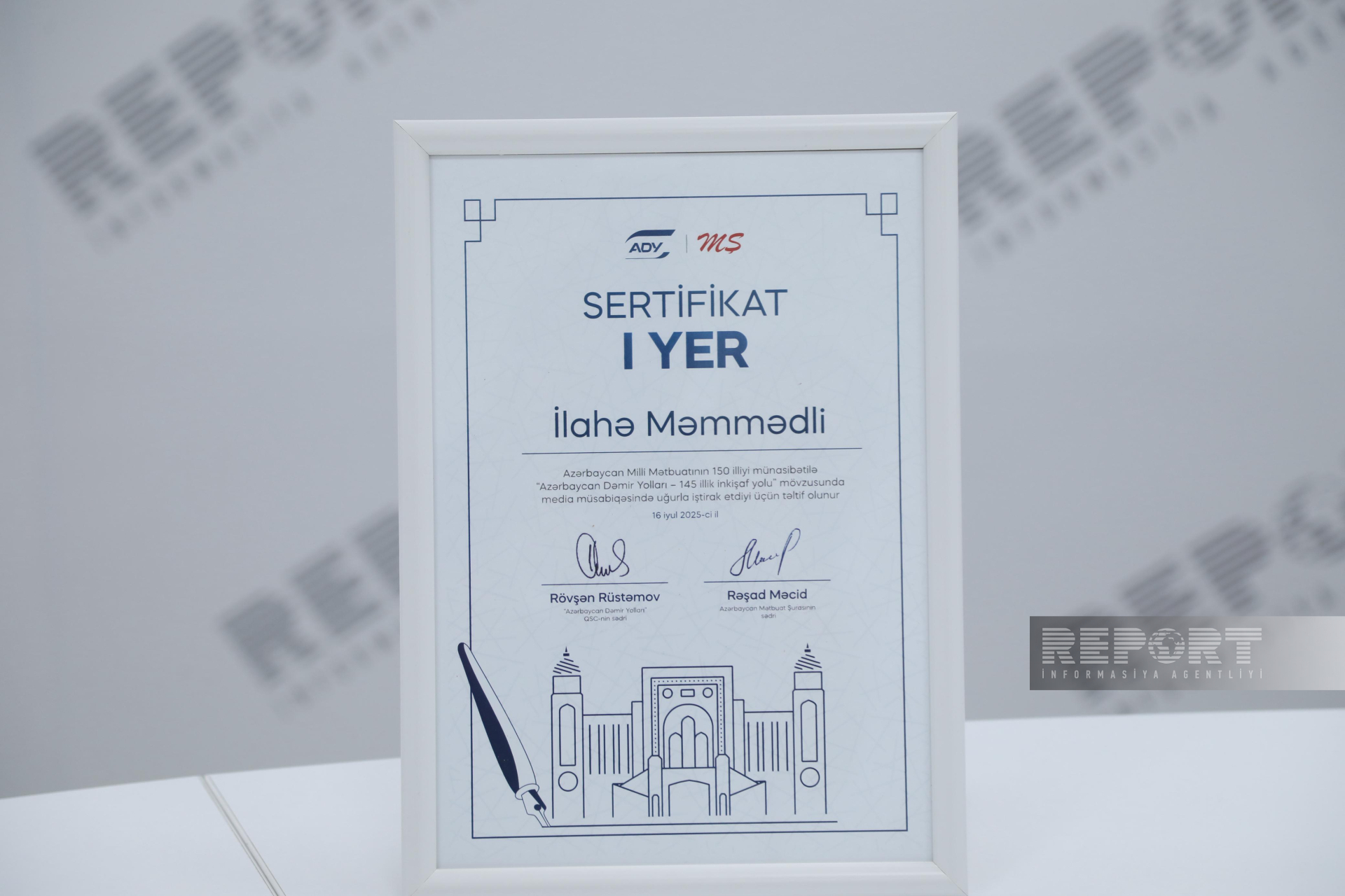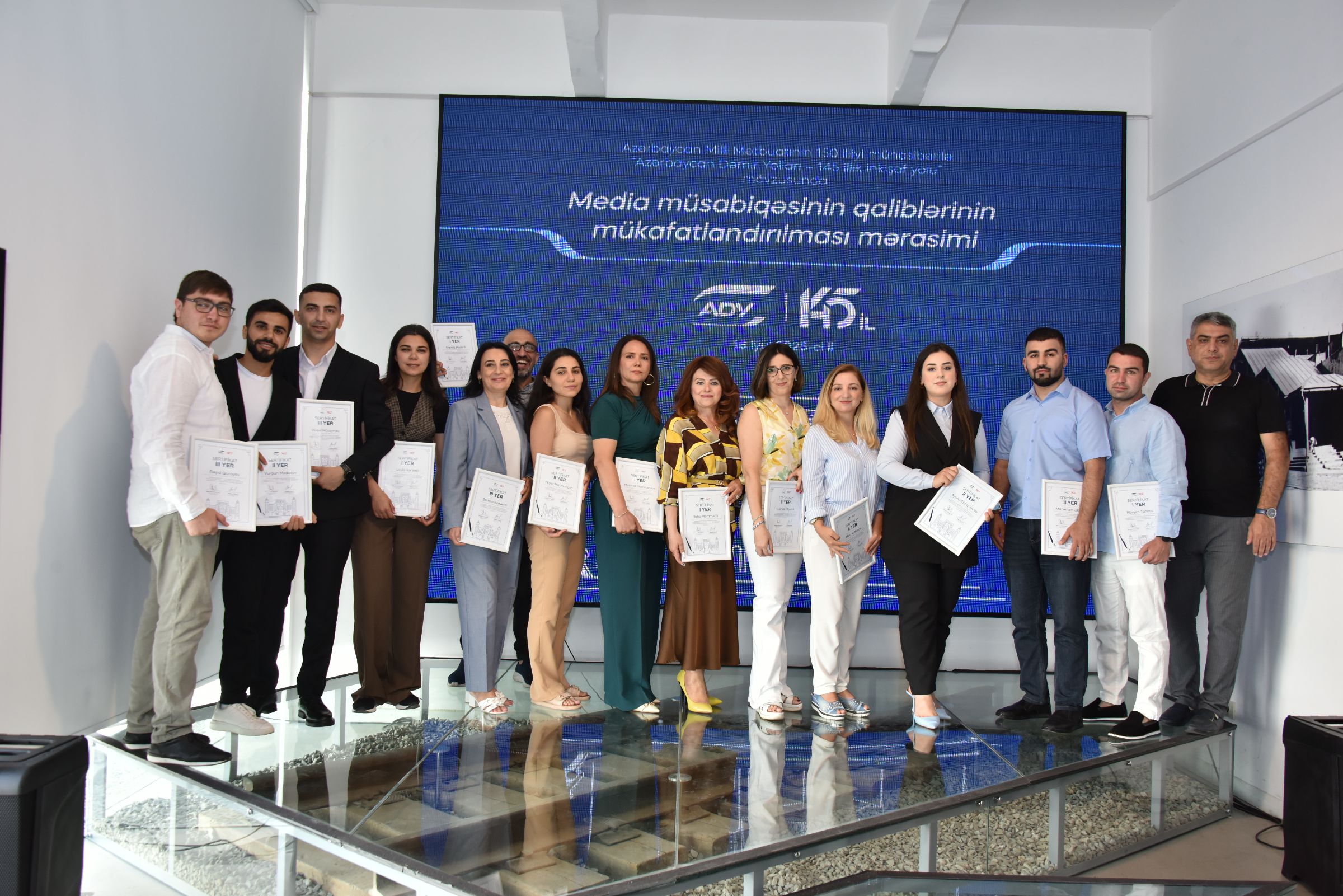 “Sizinxeber.az” xəbər verir ki, bu gün “Azərbaycan Dəmir Yolları” QSC (ADY) Mətbuat Şurası ilə birlikdə media subyektlərinin (qəzet, jurnal, informasiya agentliyi, internet informasiya resursu, TV və radio) təmsilçiləri arasında Azərbaycan milli mətbuatının 150 illiyi münasibətilə keçirdiyi müsabiqənin nəticələrini açıqlayıb.