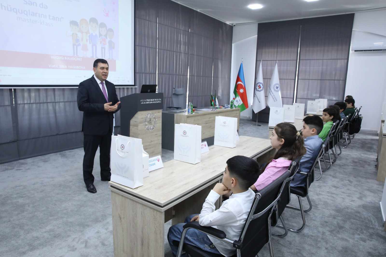 Əvvəlcə uşaqlara Akademiya haqqında məlumat verilib. Akademiyanın rektoru vəzifəsini icra edən Yusif Ağayev azyaşlıları salamlayaraq onları bu əlamətdar gün münasibətilə təbrik edib.