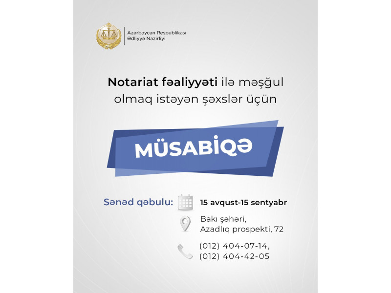 sizinxeber.az Sosial Notariat fəaliyyəti ilə məşğul olmaq istəyənlər üçün müsabiqə keçirilir Notariat fəaliyyəti ilə məşğul olmaq istəyənlər üçün müsabiqə keçirilir 596 30.iyul.2025 14:50