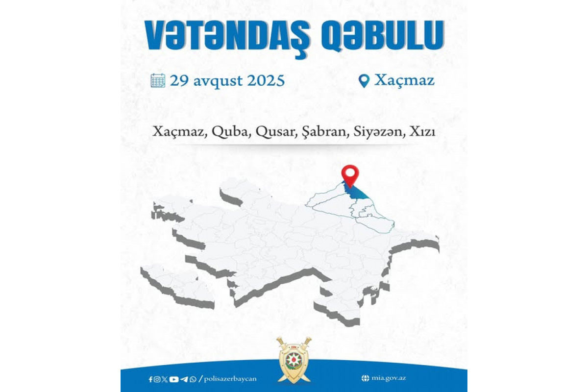 Bildirilib ki, daxili işlər naziri general-polkovnik Vilayət Eyvazov tərəfindən avqustun 22-də Xaçmaz Rayon Polis Şöbəsinin inzibati binasında Quba, Qusar, Xaçmaz, Şabran, Siyəzən və Xızı şəhər və rayonlarının sakinləri ilə keçirilməsi nəzərdə tutulan vətəndaş qəbulunun tarixi avqustun 29-a dəyişdirilib.