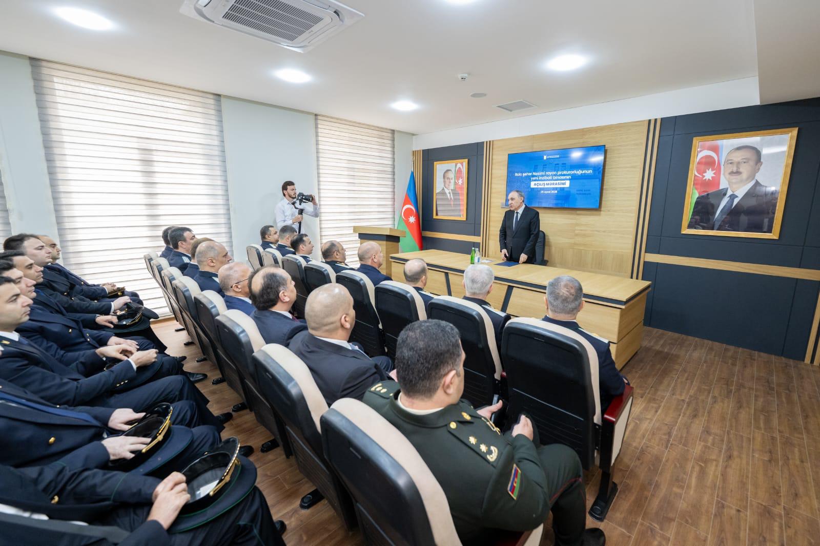 Açılış nitqində Baş prokuror Kamran Əliyev yeni inzibati binanın istifadəyə verilməsi münasibətilə prokurorluq əməkdaşlarını təbrik edərək, onlara gələcək fəaliyyətlərində uğurlar arzulayıb. O, çıxışında bildirib ki, yaradılan müasir iş şəraiti prokurorluq əməkdaşlarından daha böyük məsuliyyət, yüksək peşəkarlıq və qanunçuluğa sadiqlik tələb edir.