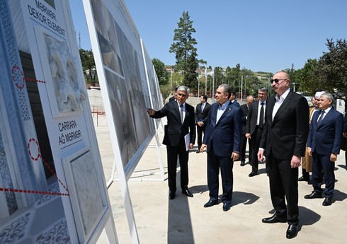 İlham Əliyev və Qurbanqulu Berdiməhəmmədov Yeni Şuşa məscidində tikinti işləri ilə tanış olublar