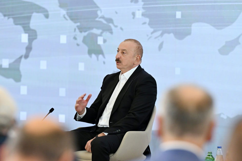Dövlət başçısı bildirib ki, Ukrayna işğalla barışmamalıdır: "Biz sırf bunu etmişik. Birinci Qarabağ müharibəsi dövrü çox çətin idi, faciəvi idi, böyük sayda itki vermişdik. Azərbaycanlılara qarşı Xocalı şəhərində soyqırımı törədilmişdi. Xocalı şəhəri buradan bir neçə kilometr aralıdadır. Münaqişədən sonrakı dövr heç də asan və yaxud da daha az ağır deyildi. Mənəvi baxımdan, həmçinin iqtisadi baxımdan çətin idi. 1 milyona yaxın insan öz bölgəsindən didərgin düşmüşdü - 700 min azərbaycanlı Qarabağ bölgəsindən, 250 min azərbaycanlı isə Ermənistandan deportasiya olunmuşdu. Və o dövrdə bizim əhalinin sayı 8 milyona bərabər idi. Adambaşına düşən qaçqın sayı çox yüksək idi, pulumuz yox idi, büdcəmiz boş idi. Demək olar ki, heç kim dəstək vermirdi. Bizim heç kimdən əhəmiyyətli beynəlxalq dəstəyimiz yox idi. İqtisadiyyat faciəvi şəkildə idi, inflyasiya, işsizlik və yoxsulluq. Yoxsulluq təxminən 100 faizə bərabər idi. Bax belə bir Azərbaycanda o vaxt Heydər Əliyev rəhbərliyə gəldi. Xalqımızın bəxti gətirdi, həmin dövrdə belə bir insan var idi ki, xalq ona müraciət etdi və o insan o çətin vəzifəni öz öhdəsinə götürdü. Həmin dövrdə heç də cavan deyildi, 70 yaşı var idi, səhhəti bir o qədər yaxşı deyildi, çətin xəstəliklərə qalib gəlmişdi. Lakin sırf o vəziyyəti sabitləşdirməyi bacardı. Və üstəlik vətəndaş müharibəsi. Tədricən biz ayaqüstə durmağa başladıq və bərpaya başladıq. Əminəm ki, əhalimizin böyük əksəriyyəti dediyimlə tam razıdır. Hamı işğal olunmuş əraziləri necə qaytarmağı düşünürdü".