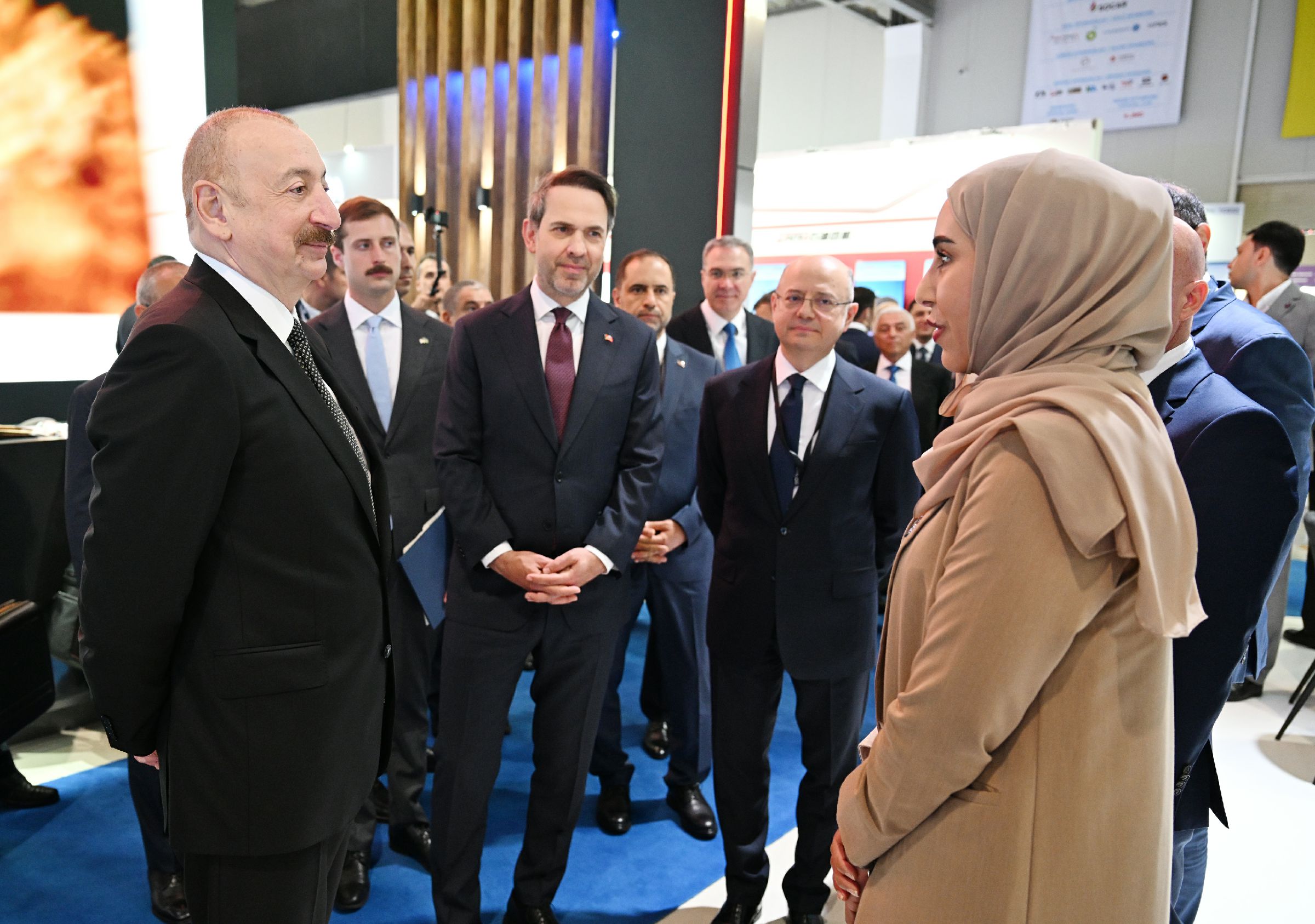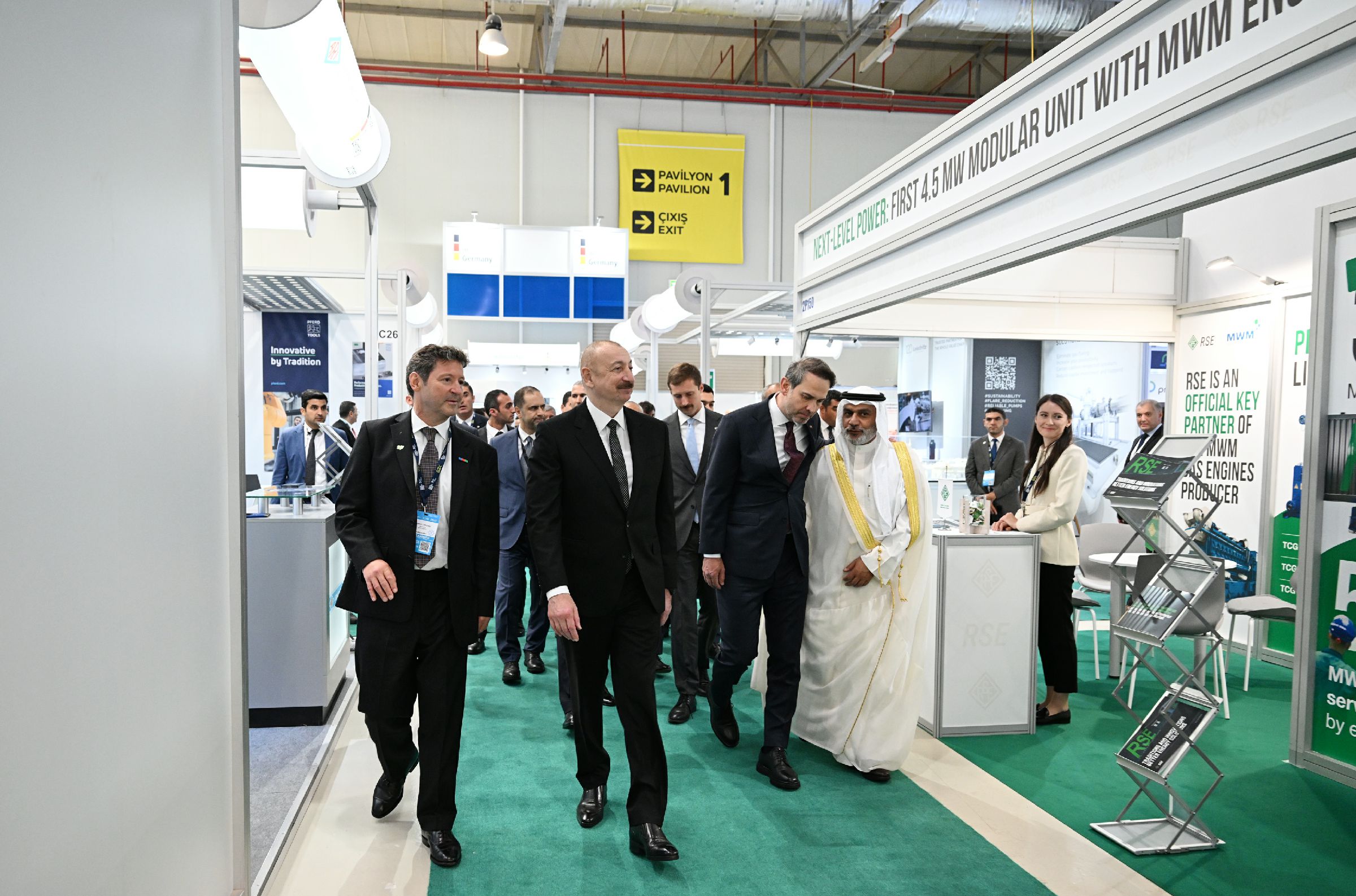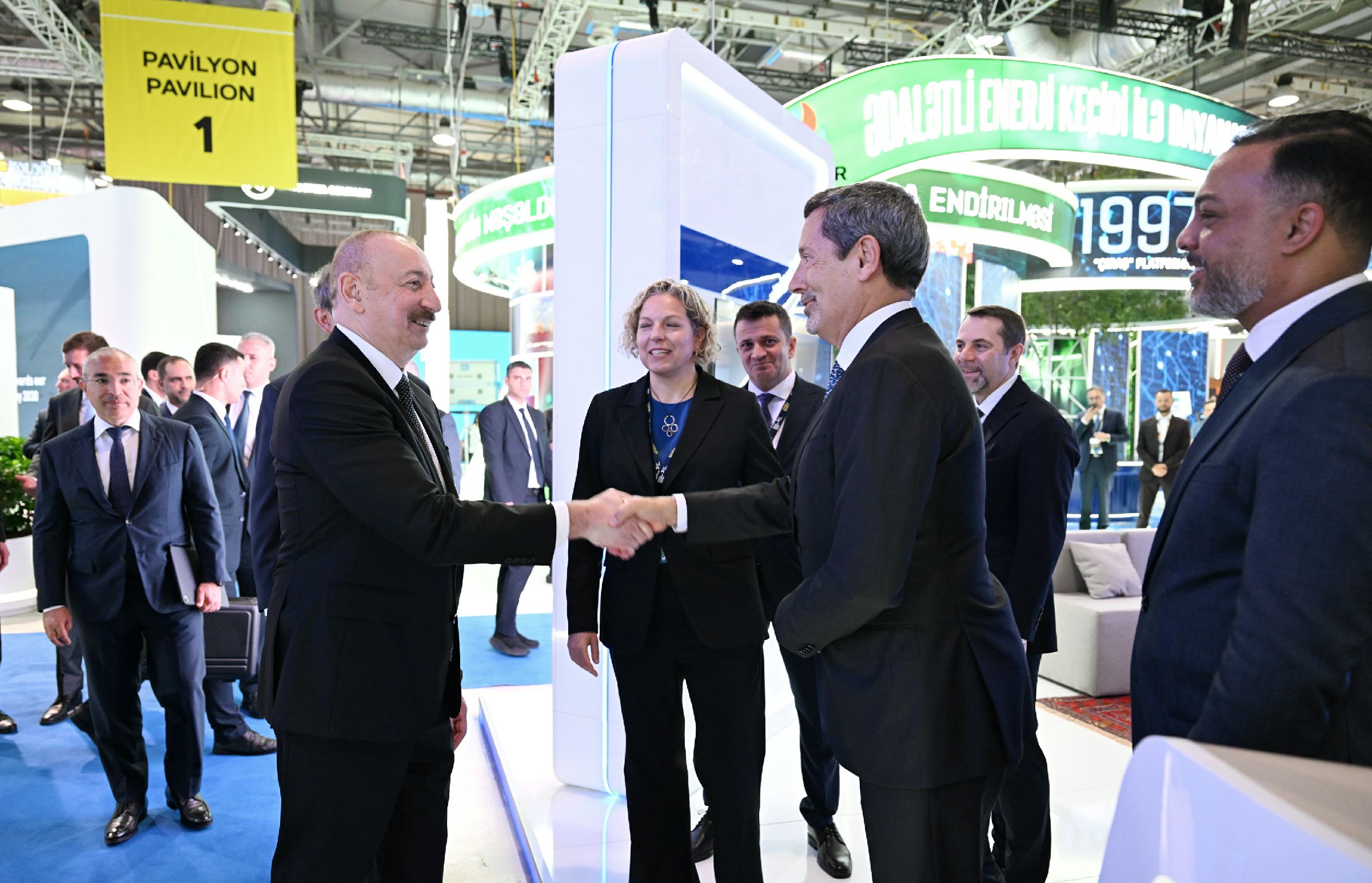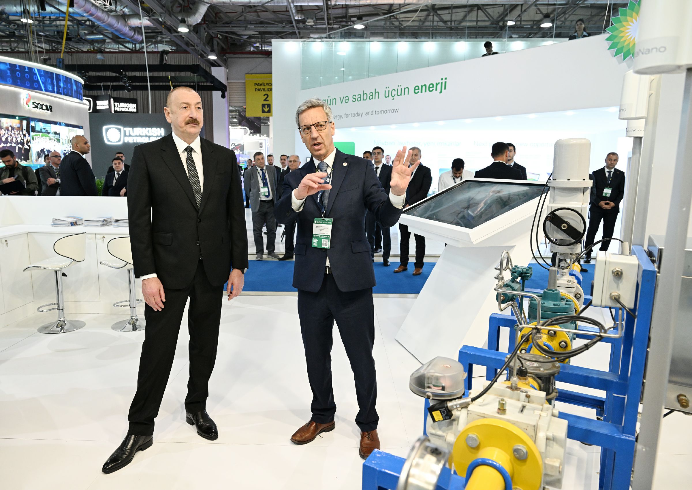 Dövlətimizin başçısı əvvəlcə Azərbaycanın və strateji tərəfdaşlarının enerji təhlükəsizliyinə mühüm töhfə verən SOCAR-ın stendinə baxdı. Bildirildi ki, SOCAR qlobal enerji şirkəti olaraq milli sərvətlərimizin beynəlxalq bazarlara çıxarılmasında strateji rol oynayır. Neft-qaz şirkətindən beynəlxalq enerji şirkətinə transformasiya istiqamətində məqsədyönlü fəaliyyətini davam etdirən SOCAR keyfiyyətli idarəetmə, şəffaflıq və müasir yanaşmalar əsasında enerji sektorundakı mövqeyini ardıcıl olaraq möhkəmləndirir. Axtarış-kəşfiyyat, hasilat, nəqletmə, emal, istehsal, marketinq, yanacağın pərakəndə satışı, qaz paylanması və bərpaolunan enerji mənbələrinin inkişafı kimi sahələrdə uğurla fəaliyyət göstərən şirkət rəqəmsallaşma, innovasiya, yaşıl enerjiyə keçid vasitəsilə davamlı inkişafı və dayanıqlı artımı təşviq edir. SOCAR, həmçinin iqlim dəyişikliyi ilə mübarizədə fəal iştirak edərək, ekoloji cəhətdən təmiz, aşağıkarbonlu və qabaqcıl texnologiyaların tətbiqinə üstünlük verir.