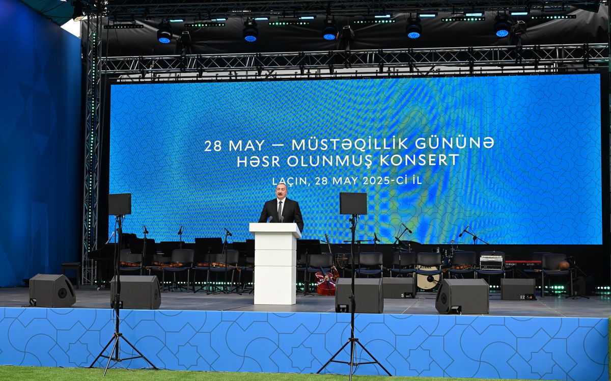 İndi isə azad edilmiş bütün torpaqlarda bərpa işləri, quruculuq işləri gedir. Böyük infrastruktur layihələri icra edilir - xəstəxanalar, məktəblər, üç hava limanı tikilib, dəmir yolları, avtomobil yolları salınıb, 70 kilometrə yaxın tunelin inşası sürətlə gedir. Bu gün bizim qonaqlarımız azad edilmiş torpaqlarda gedən işlərin bir hissəsi ilə tanış olmuşlar. Artıq Şərqi Zəngəzur və Qarabağ bölgələrimizdə 43 min insan yaşayır və çalışır. Bu bölgəyə həyat qayıdıb, bu bölgənin sahibləri qayıdıblar. Biz qayıtmalıydıq və qayıtmışıq. Biz Ermənistan ordusunu məğlub etmişik və bununla Azərbaycan xalqı fəxr edir. Artıq dörd ildən çoxdur ki, biz müzəffər xalq və dövlət kimi yaşayırıq və əbədiyyətə qədər yaşayacağıq. Bu gün əziz qardaşlarımın - Türkiyə Prezidentinin və Pakistanın Baş nazirinin bizimlə bərabər bu bayram tədbirlərində iştirakı, bizə göstərilən dəstək və həmrəylik artıq tamamilə yeni dünya miqyasında reallıqlar yaradır. Bizim gücümüz birliyimizdədir. Bu gün birliyimizi üçtərəfli formatda bir daha təsdiqlədik. Bu gün bayram konsertində səslənəcək mahnılar bir daha bizim birliyimizi, nə qədər zəngin mədəniyyətə malik olmağımızı göstərəcək. Əminəm ki, azad edilmiş Laçından üç ölkənin bu gün dünyaya verdiyi mesajlar lazımi ünvana çatacaq.