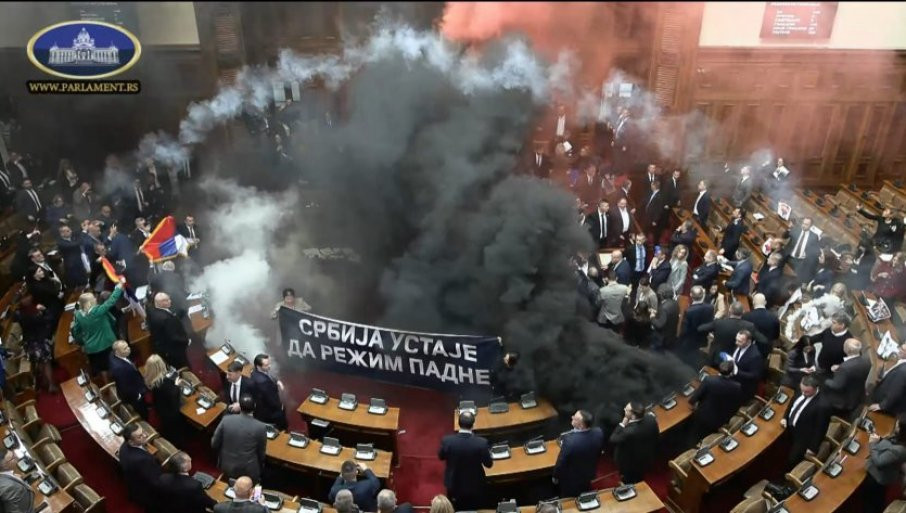 Serbiya müxalifətinin deputatları hökumətin siyasətinə etiraz olaraq parlamentə tüstü bombaları atıblar.